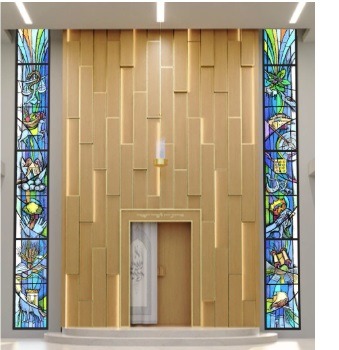 The Aron Kodesh will be the centerpiece of the shul and will be surrounded by stained glass windows of the 12 shvatim. The variegated wood treatment of the mizrach wall inside the shul will be mirrored in stone on the Eastern exterior facade of the building.